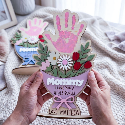 Personalized Wooden Flower Bouquet Handprint Sign With Flat Base, Custom Mom Grandma Handprint Plaque, Kids Fingerprint Art Gift, Mother Day Keepsake, Family Name Sign