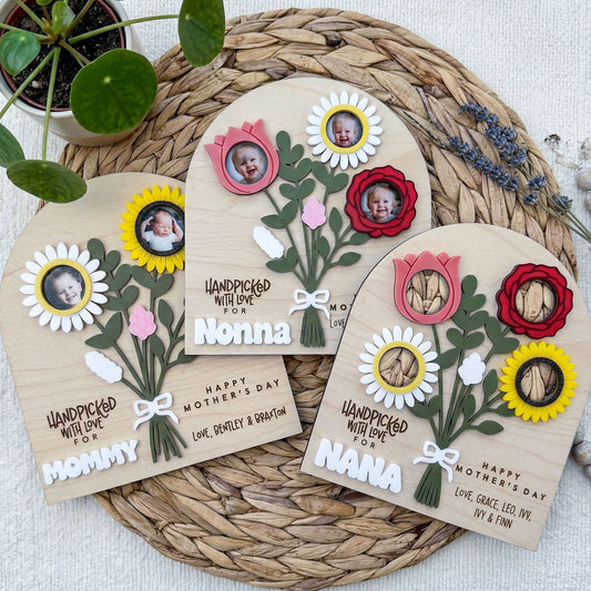 Personalized Flower Bouquet Wooden Photo Sign, Custom Family Photo Plaque for Mom Grandma Nana, Handpicked With Love Design, Mother’s Day Gift, Kids Photo Keepsake