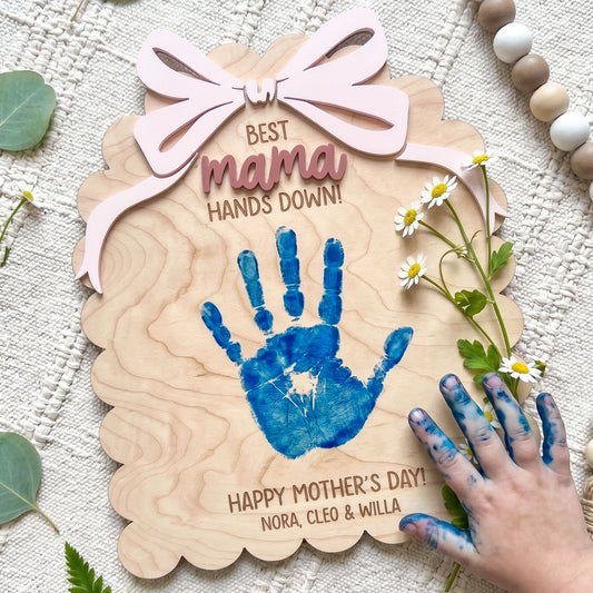 Personalized DIY Bow Ribbon Scallop Handprint Sign, Custom Kids Handprint Keepsake Plaque, Best Mama Grandma Hands Down Design, Mother’s Day Gift, Family Keepsake Decor