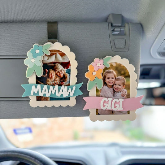 Personalized Cute Floral Photo Frame Fridge Magnet or Car Visor Clip with Name Banner, Custom Family Photo Magnet for Mom Grandma Auntie, Mother’s Day Gift