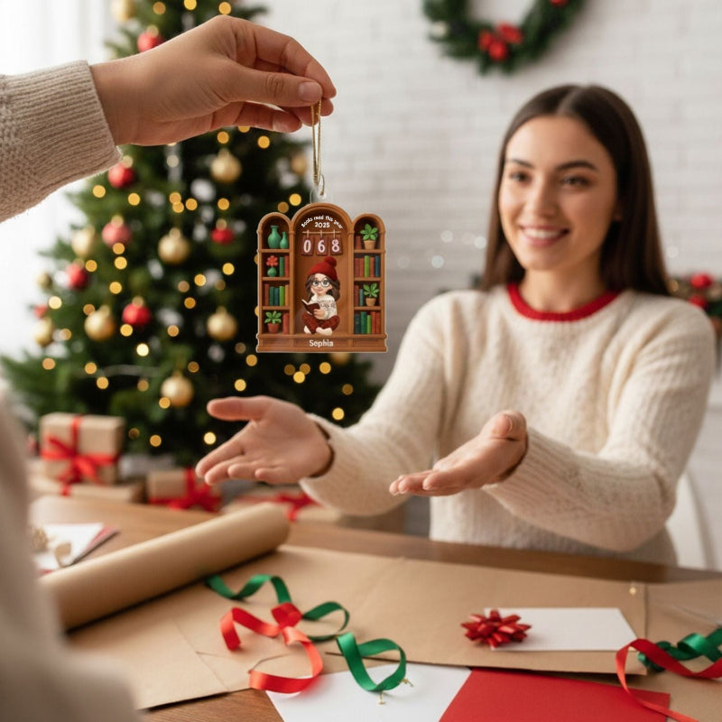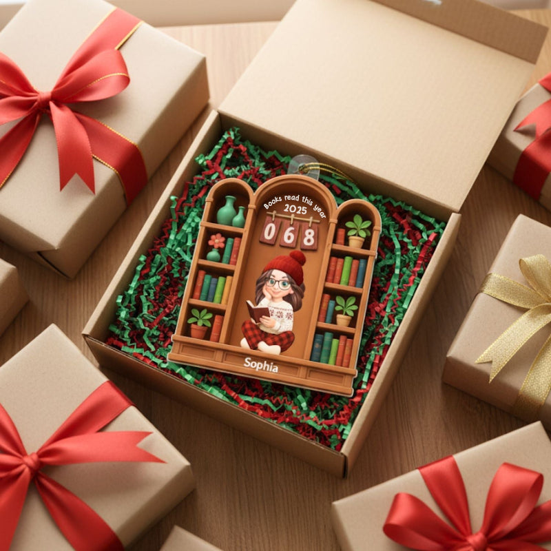 Books Read This Year, Personalized Girl Sitting On Bookshelf Acrylic Ornament, Gifr For Book Lover, Bookworm