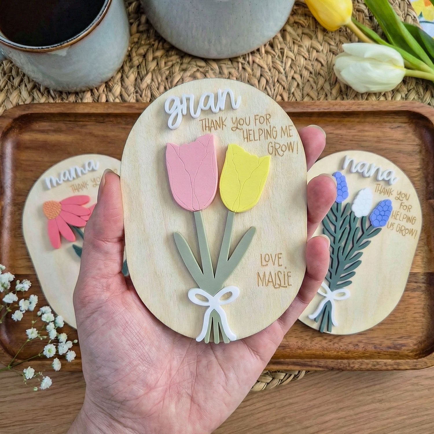 Show your appreciation with this heartfelt Personalized Quote Floral Wooden Magnet Sign. Featuring the touching message “Thank You For Helping Me Grow” and delicate floral elements, this charming fridge magnet is a beautiful reminder of love, gratitude, and the special bond between children and the ones who nurture them.